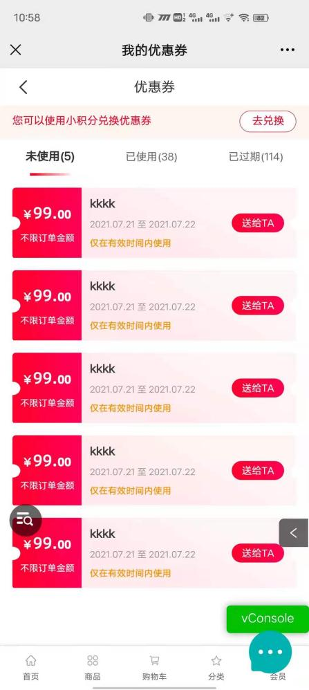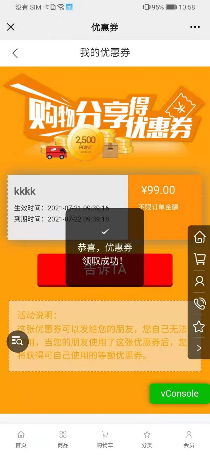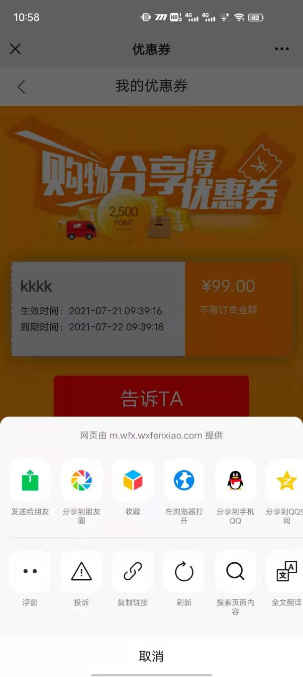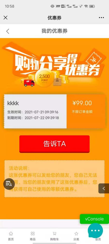 用戶場景:購物分享得優惠券活動,在小程序優惠券點擊送給TA可以正常使用