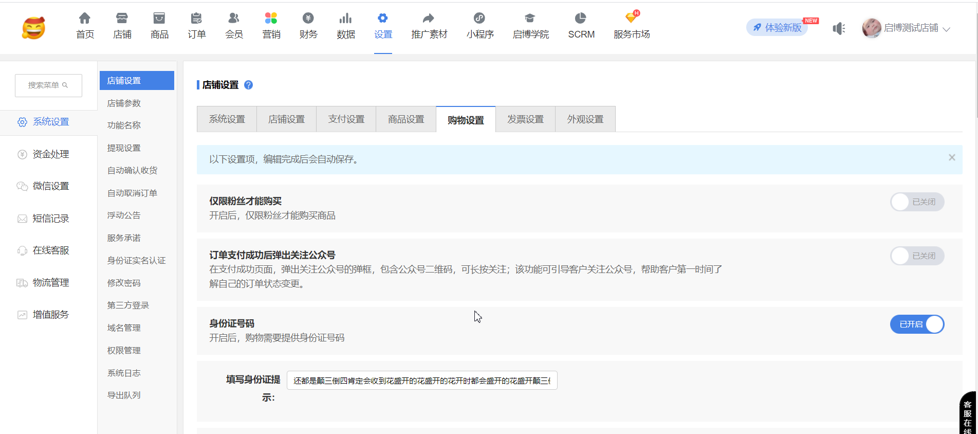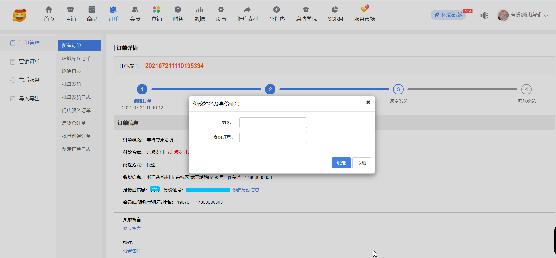 用戶場景:系統設置-店鋪設置-開啟”跨境電商模式”、”身份證號碼”;同時,系統設置-“身份證實名認證”,”是否開啟身份證實名認證”和”是否驗證訂購人姓名”開啟后,在手機端訂單詳情可以修改”訂購人”信息,后臺訂單詳情同步修改后”訂購人”信息。