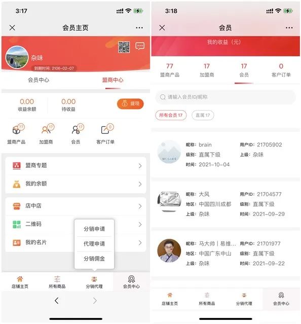 1、分銷商A購買產品時會自動生成微店,下級分銷商(B)購買商城內商品時A會自動實現13%的利潤,B的店也會自動開張。