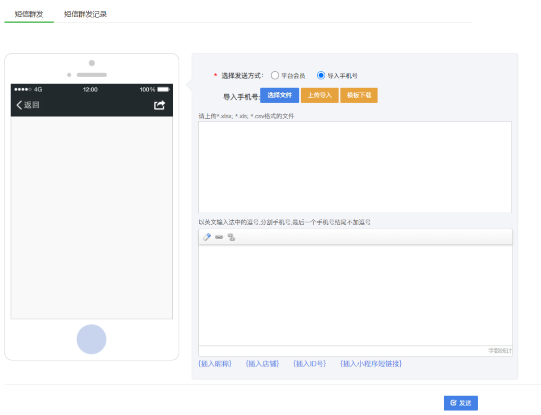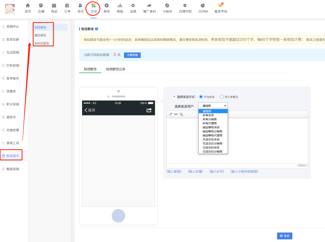 ① 短信群發(fā):以短信的形式發(fā)給商城內(nèi)的會(huì)員、分銷商、代理商、訂貨商等用戶,也可以導(dǎo)入手機(jī)號(hào)到平臺(tái)內(nèi),將短信發(fā)送給這批自定義用戶;