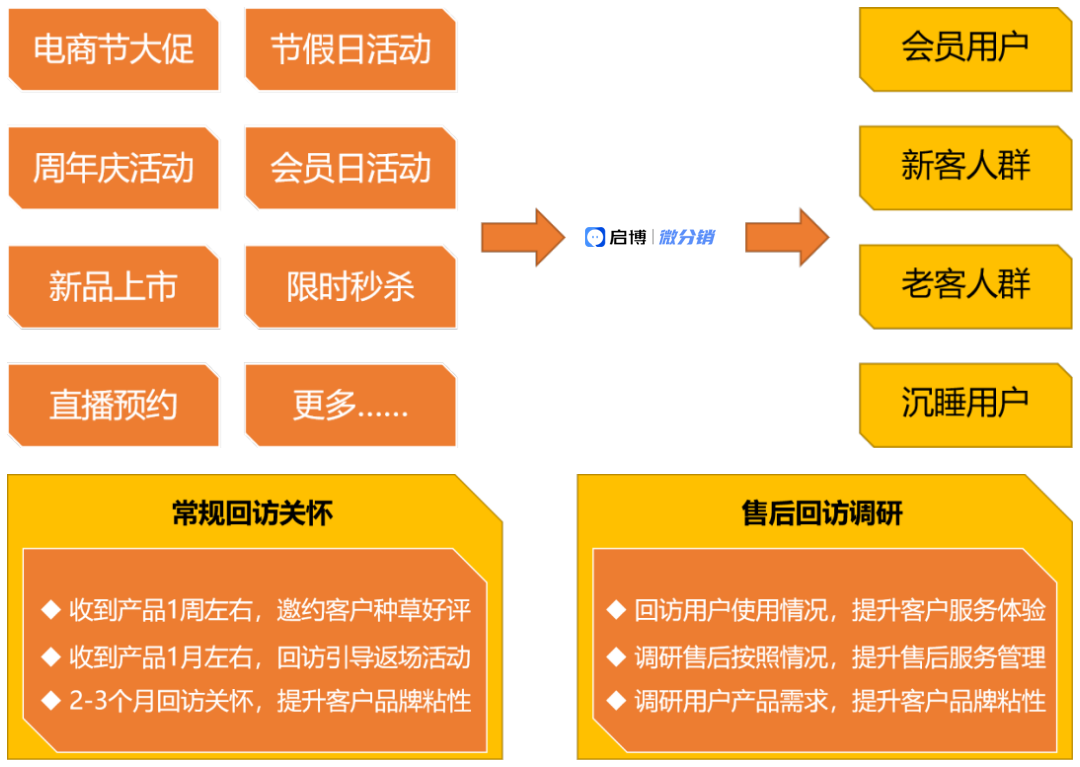 在用戶購(gòu)買產(chǎn)品后,做邀約用戶種草好評(píng)、引導(dǎo)返場(chǎng)活動(dòng)、回訪使用情況、調(diào)研產(chǎn)品需求等環(huán)節(jié),提升用戶服務(wù)體驗(yàn)和品牌粘性。