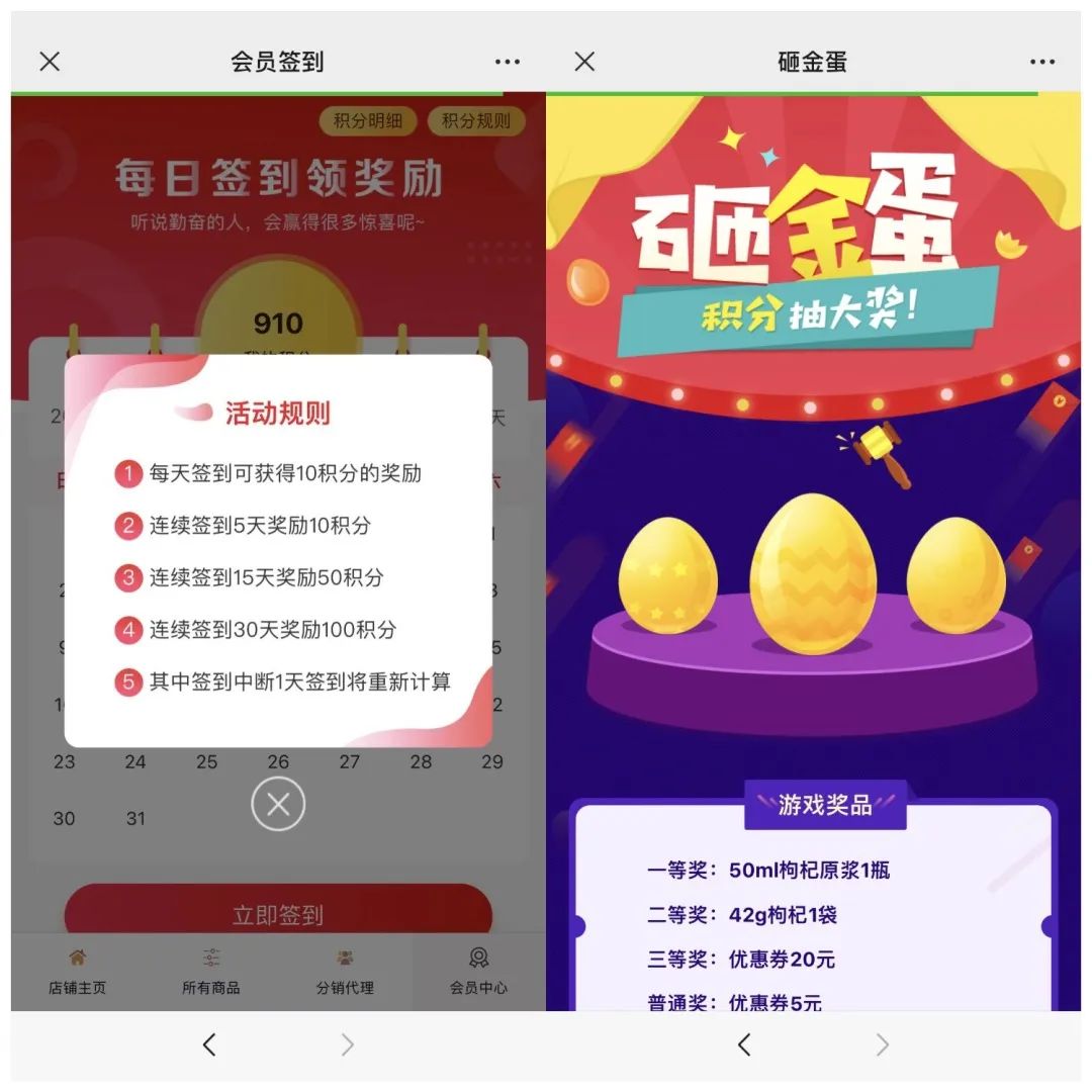 早康枸杞微商城內(nèi)的積分營(yíng)銷,支持消費(fèi)者用積分可以免費(fèi)兌換一些商品,也可以消耗積分玩游戲的形式抽取商城內(nèi)的獎(jiǎng)品或者優(yōu)惠券,積分+游戲化營(yíng)銷將平臺(tái)上的電商屬性搭建起來,從而提升用戶的復(fù)購(gòu)和消費(fèi)頻次。