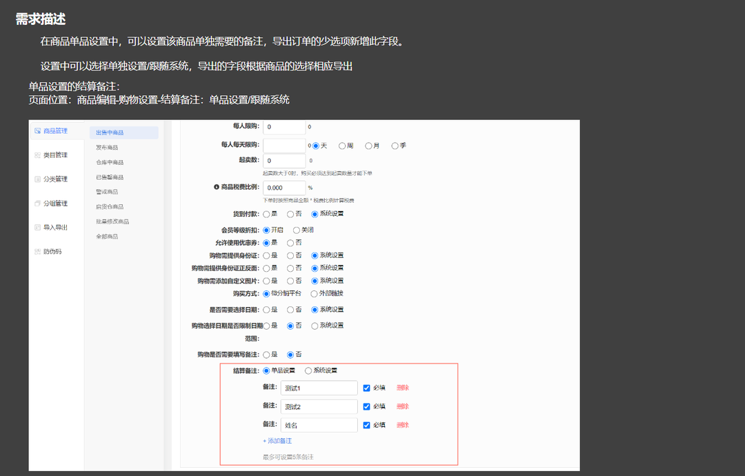 需求描述:在商品單品設(shè)置中,可以設(shè)置該商品單獨(dú)需要的備注,導(dǎo)出訂單的少選項(xiàng)新增此字段。設(shè)置中可以選擇單獨(dú)設(shè)置/跟隨系統(tǒng),導(dǎo)出的字段根據(jù)商品的選擇相應(yīng)導(dǎo)出單品設(shè)置的結(jié)算備注。