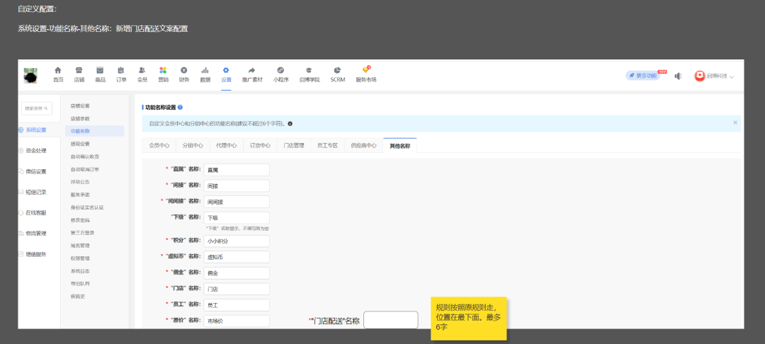 后臺(tái)自定義配置位置:系統(tǒng)設(shè)置-功能名稱(chēng)-其他名稱(chēng):新增門(mén)店配送文案配置。
