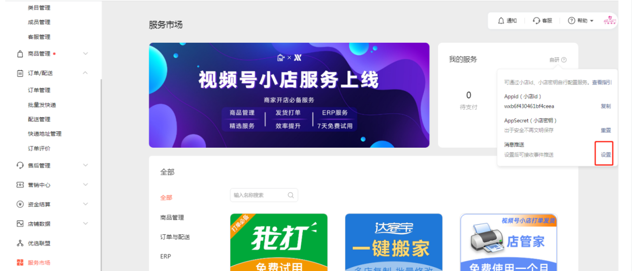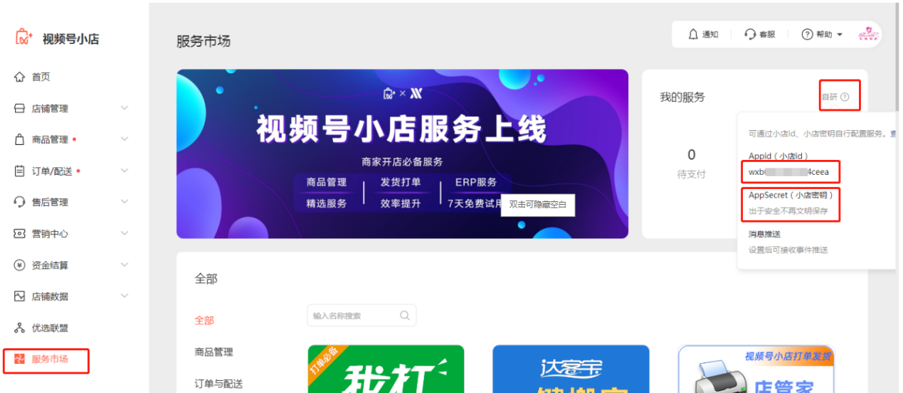 AppID &AppSecret:在視頻號小店-服務市場-自研中獲取