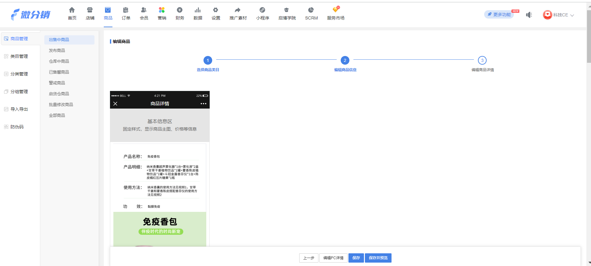 此頁面操作位置:微分銷PC端商家管理后臺-商品-商品管理-出售中商品-編輯商品