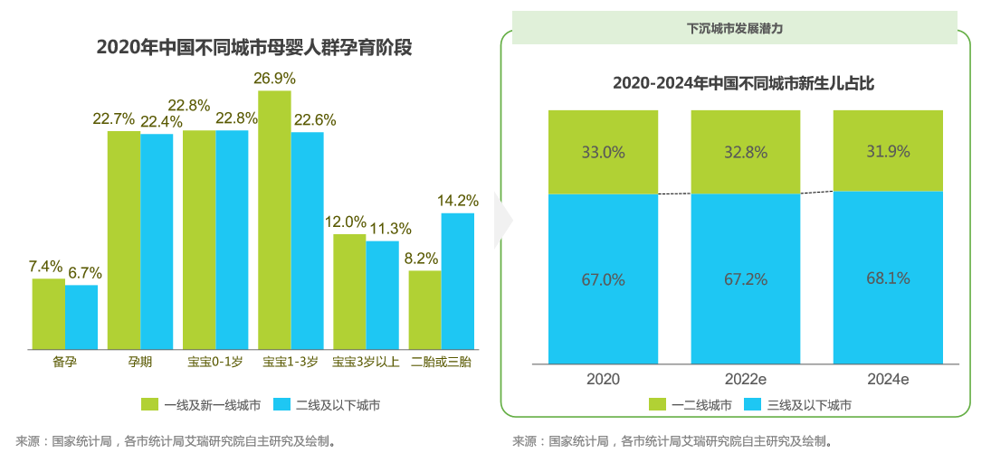 隨著生育鼓勵政策的推進,國內下沉市場新生兒消費需求將成為推動母嬰行業增量市場的重要驅動因素。從新生兒占比來看,三線及以下城市新生兒童占比是一二線城市2倍多,展現了其母嬰產品的發展潛力;其中三線及以下城市2020年新生兒占比67%,預計到2024年提高至68.1%,未來三線及以下市場對于母嬰產品的需求將逐步增加。