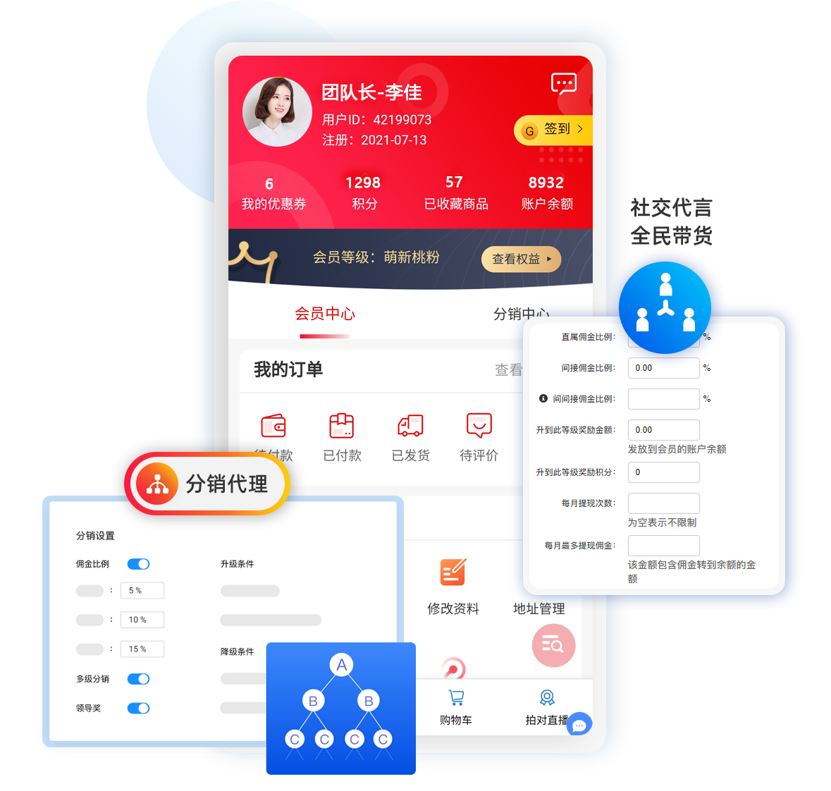 分銷代理模式社交分銷,實現全民帶貨。以推客為中心,利用返傭機制,把用戶主動