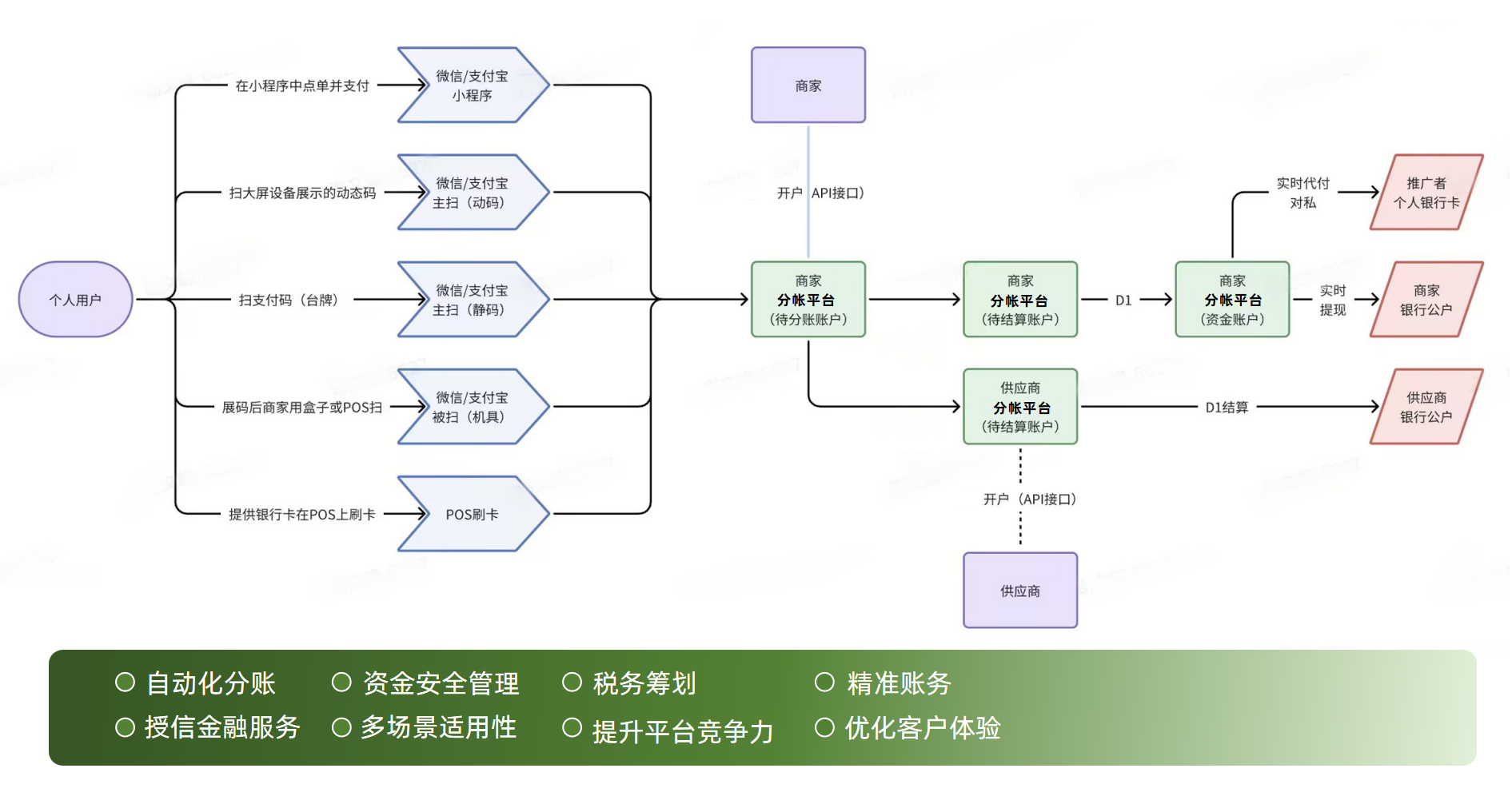 通過靈活的分賬清算和實(shí)時(shí)分賬功能,為企業(yè)提供高效的多商戶入賬解決方案,優(yōu)化資金流轉(zhuǎn),降低運(yùn)營成本,增強(qiáng)合作伙伴間的財(cái)務(wù)協(xié)作效率,助力企業(yè)實(shí)現(xiàn)更精細(xì)的資金管理和業(yè)務(wù)擴(kuò)展。