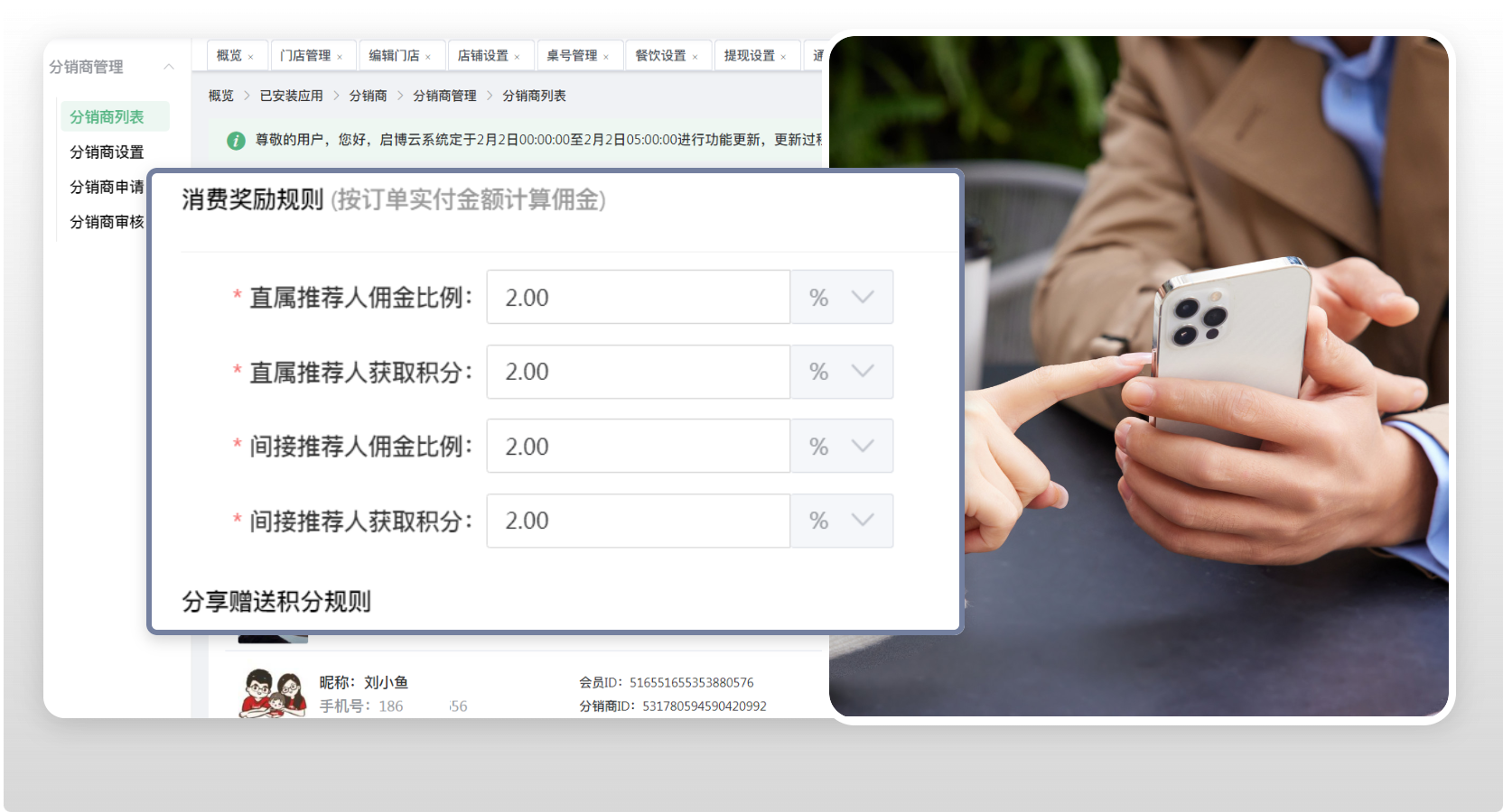 快速開啟二級分銷裂變模式,系統內置多種分銷規則,快速配置實現分銷返傭,傭金比例靈活設置,自動結算;分銷等級可自動按條件升降級,促進推廣員的推廣積極性。